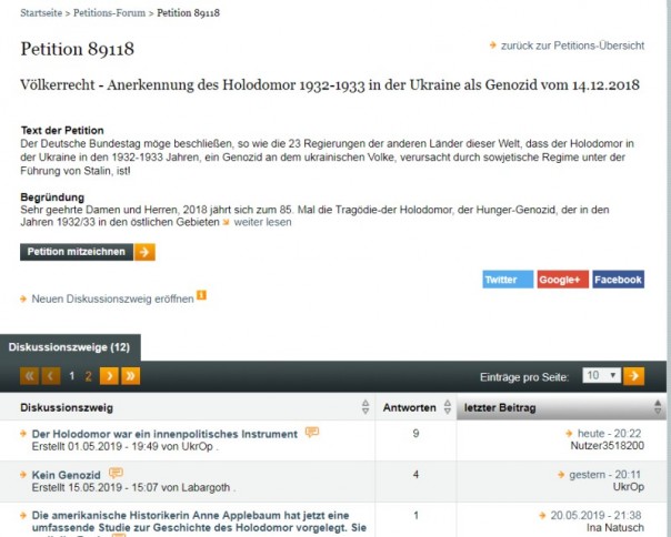 Но как следует из информации, размещенной на сайте Бундетага, за признание голодомора геноцидом украинского народа по состоянию на 23 мая было собрано почти 20 тысяч подписей из 50 тысяч, необходимых для того, чтоб этот вопрос был рассмотрен комитетом по петициям германского парламента и затем, возможно, Бундестагом. Дедлайн для желающих поддержать петицию наступает 27 мая и есть большие сомнения, что её инициаторам удастся привлечь недостающие для достижения кворума тридцать тысяч голосов за оставшиеся четыре дня. Источник