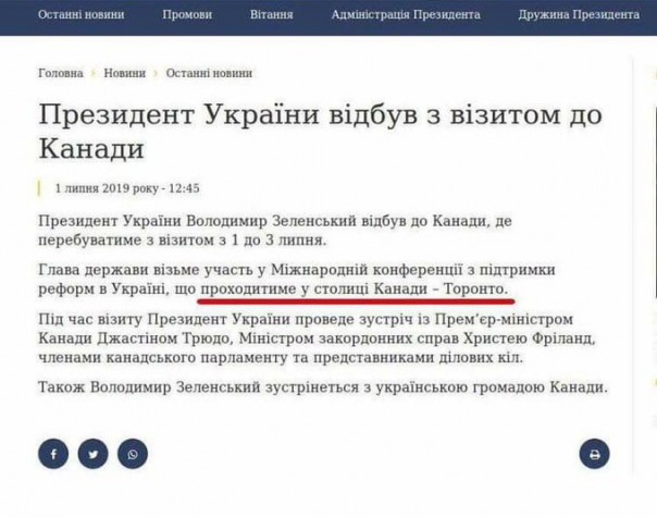 Позднее сотрудники пресс-службы украинского лидера исправили ошибку, указав, что Торонто – столица канадской провинции Онтарио.