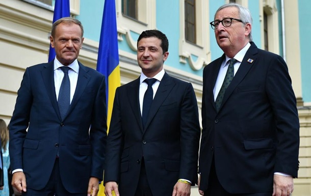 Украинский президент Владимир Зеленский, президент ЕС Дональд Туск и президент Еврокомиссии Жан-Клод Юнкер проводят совместную пресс-конференцию после саммита Украина-ЕС