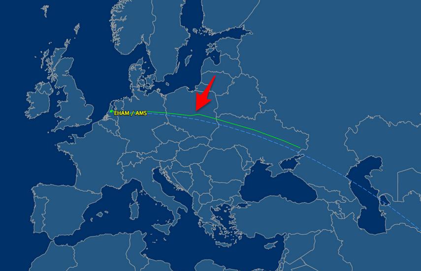 Польские эксперты в связи с этим приводят следующую иллюстрацию (со ссылкой на источник Flight Aware) "планировавшейся трассы полета малайзийского "Боинга" (голубым пунктиром) и трассы, которую скорректировали сначала в Германии, а затем на территории Польши (зеленая линия)".