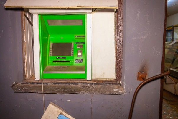 Злоумышленники запустили в щель банкомата трубку с газом. Чтобы забрать деньги, им пришлось взломать дверь магазина.