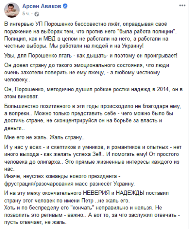 Глава МВД Украины Арсен Аваков заявил, что экс-президент Петр Порошенко бессовестно солгал, говоря о причинах провала его партии «Европейская солидарность» на выборах в Верховную Раду, обвинив полицию в работе против его политического союза в предвыборной компании.