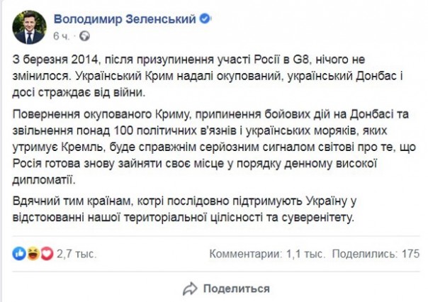 Также глава украинского государства отметил, что "с марта 2014 года после приостановления участия России в G8 ничего не изменилось. Украинский Крым в дальнейшем оккупирован, украинский Донбасс до сих пор страдает от войны".