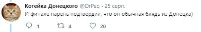 «И финале парень подтвердил, что он обычная бл*дь из Донецка», - пишет пользователь сети под ником Котейка Донецкого.