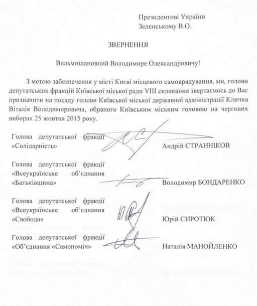 "С целью обеспечения в городе Киеве местного самоуправления, мы, председатели депутатских фракций Киевского городского совета VIII созыва, обращаемся к Вам назначить на должность главы Киевской городской государственной администрации Кличко Виталия Владимировича, избранного Киевским городским головой на очередных выборах 25 октября 2015г", - говорится в обращении.