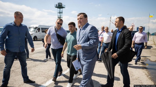 Зеленский в двух шагах от «агрессора» на границе с Крымом. Обратите внимание на экипировку Зеленского и его охраны в стиле «на отвяжись». Единственное, что вызывает удивление, это забор с колючей проволокой между люди и Верховным.