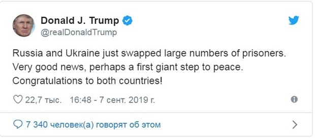 Президент США Дональд Трамп назвал взаимный обмен заключенными между РФ и Украиной хорошей новостью и «гигантским шагом к миру». Об этом американский лидер 7 сентября написал в своем Twitter.