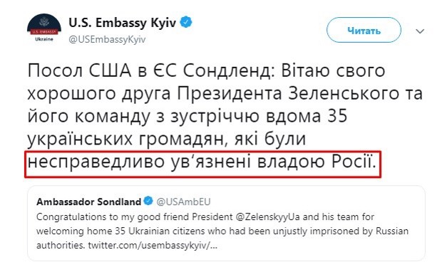 Посол США в ЕС Сондленд: Приветствую своего хорошего друга Президента Зеленского и его команду со встречей дома 35 украинских граждан, которые были несправедливо заключенными властью России.