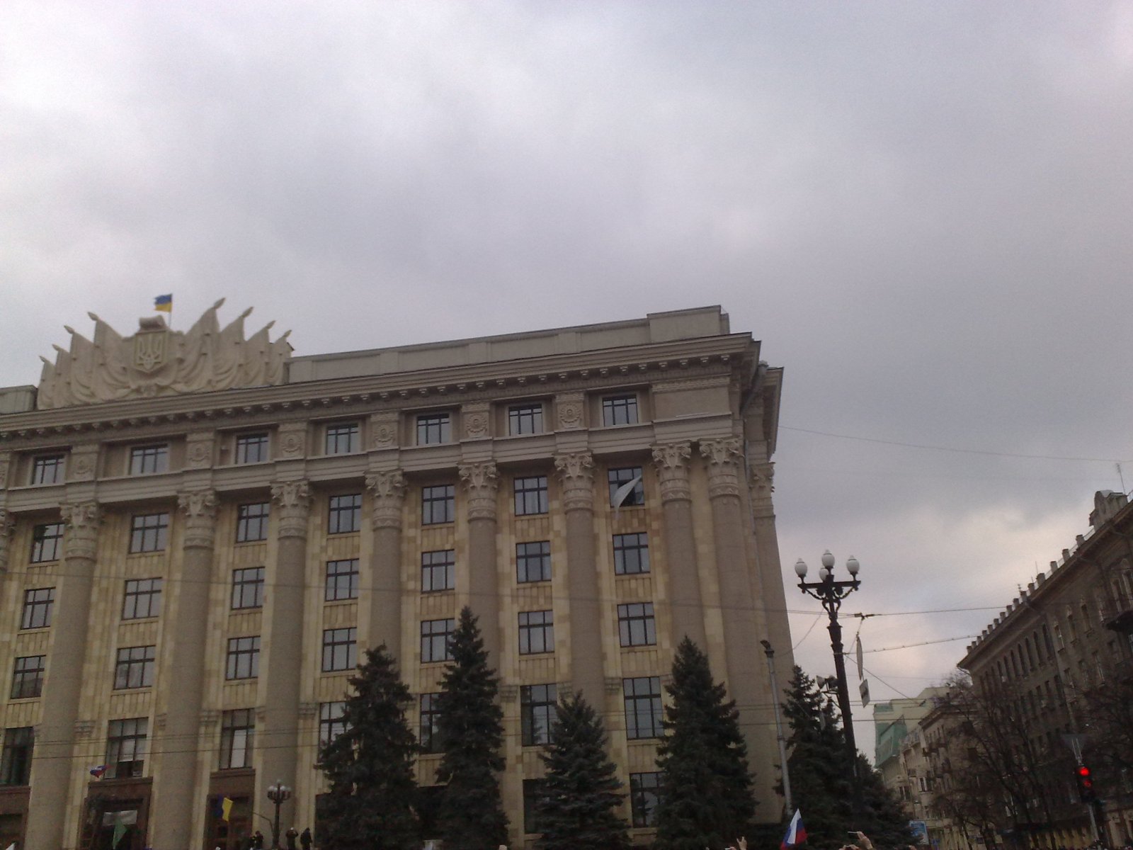 Над зданием ОГА был поднят Российский флаг. Украинский флаг тоже там же. Просто по телевизору могли показать что там только Российский флаг. Это неправда. Был какой-то недолгий момент (может минут 10, максимум 15) когда украинского флага не было, но затем всё вернулось.