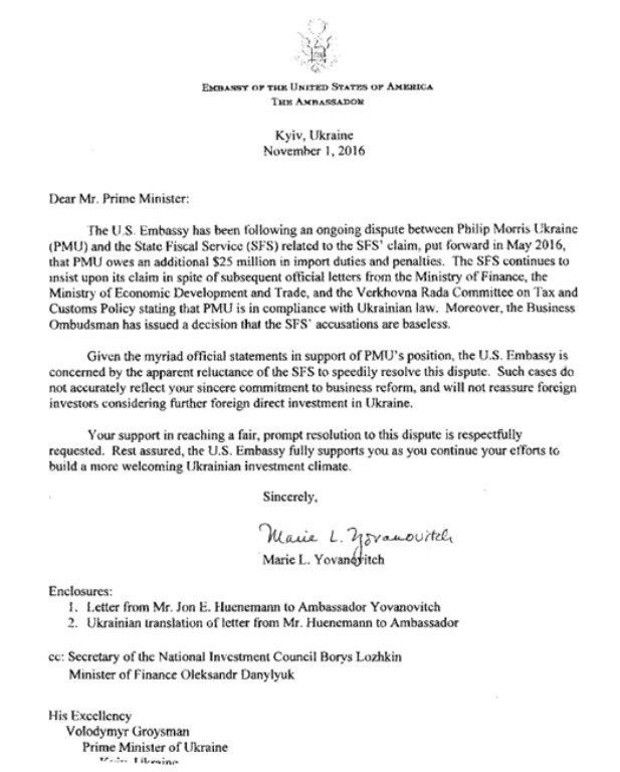 В своем письме Гройсману Йованович очень явно намекает, что конфликт должен быть решен. При этом она отмечает, что действия ГФС не отображают желание Украины идти к реформам, а подобный скандал может негативно сказаться на иностранных инвестициях для страны.