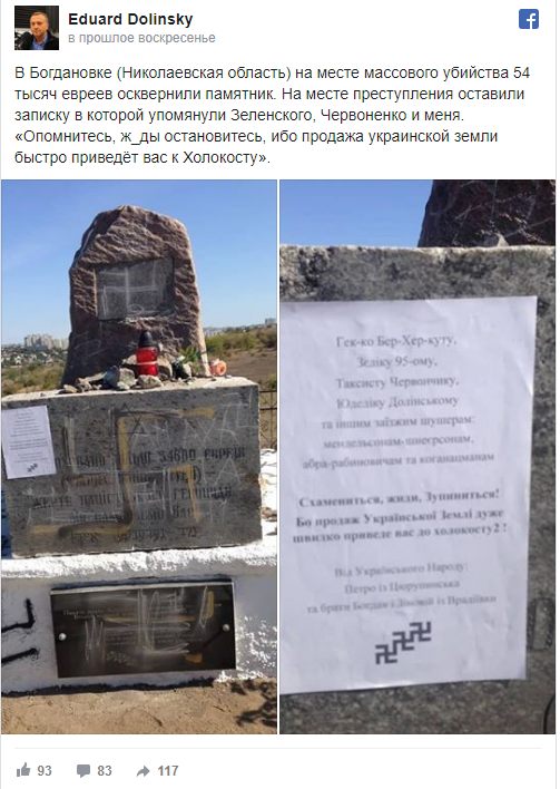 Ранее на странице Эдуарда Долинского было опубликовано сообщение об осквернении другого памятника, установленного в селе Богдановка Николаевской области, где во время Второй мировой войны немецкие и румынские оккупанты вместе с украинскими коллаборационистами убили 54.000 евреев.