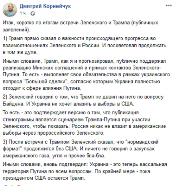 Комментируя то, что Зеленский говорил о том, что Трамп не давил на него по вопросу Байдена и Украина не хочет влазить в выборы в США Корнейчук пишет: