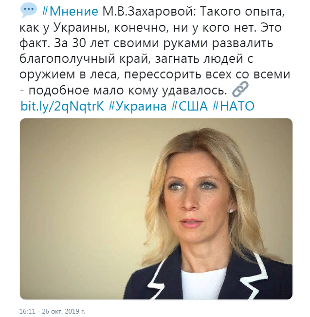 По мнению дипломата, реальный опыт Украины, который может быть интересен НАТО – это "опыт самоуничтожения". Она отметила, что за 30 лет стране удалось "привести в упадок благополучный край, загнать людей с оружием в леса, а также перессорить всех со всеми".