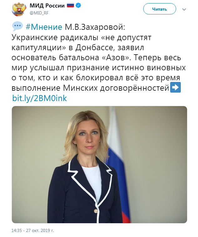 Официальный представитель МИД Мария Захарова прокомментировала слова лидера батальона "Азов" Андрея Билецкого о "недопущении капитуляции" в случае развода войск в Донбассе. Ее слова приведены в твиттере Министерства иностранных дел.