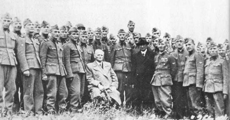 Эти батальоны участвовали в карательных операциях против мирного населения и Холокосте. Мыхайло также один из организаторов дивизии СС Галиция. На фото он сидит в окружении офицеров и старшин дивизии СС Галиция. На другом архивном фото – Иван Берчак, его друг и коллега по Унакору — командир 103-го батальона шуцманшафт, убийца тысяч украинских евреев.