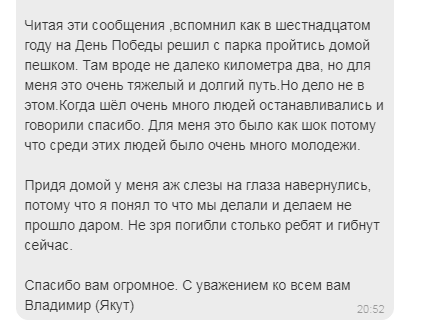 Читая эти сообщения, вспомнил как в 2016-м году на День Победы решил с парка пройтись домой пешком. Там вроде не далеко километра два, но для меня это очень тяжелый и долгий путь. Но дело не в этом. Когда шёл, очень много людей останавливались и говорили:«Спасибо!». Для меня это было шоком, потому что среди этих людей было очень много молодежи.