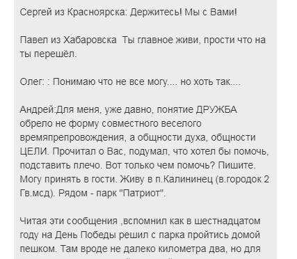 Вы даже представить не сможете те чувства, которые испытывают наши, читая о том, что их поддерживает Питер, Омск, Урал, Самары, Москва, Нижний Новгород, Иркутск, Снежинск, Тула, поддерживают из США, поддерживают из Сирии, причем из Посольства России! Поддерживают из Украины, даже из ЛНР, где мягко говоря, не богато живется.