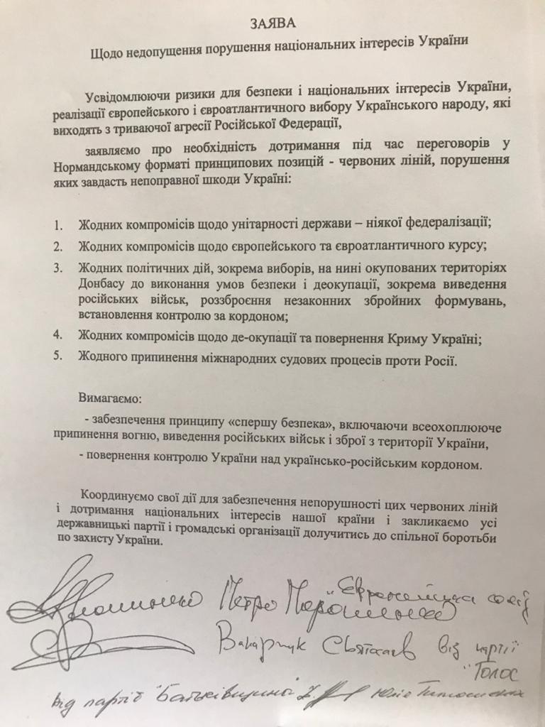 В связи с этим координируем свои действия для обеспечения нерушимости этих красных линий и соблюдения национальных интересов нашего государства, и призываем все государственные партии и общественные организации присоединиться для общей борьбы по защите Украины.