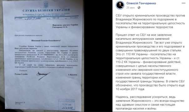 «Пришел ответ из СБУ на мое заявление касательно антиукраинских заявлений Владимира Жириновского. Так вот уже открыто криминальное производство и его подозревают в совершении правонарушений по двум статьям. Это ст. 110 КК Украины - посягательство на территориальную целостность Украины - и ст. 110-2 КК Украины - финансирование действий, совершенных с целью насильственного изменения или свержения конституционного строя или захвата государственной власти, изменения границ территории или государственной границы Украины. В ответе СБУ обозначено, что производство было открыто еще 10 ноября 2017 года», - написал Гончаренко у себя в Facebook.