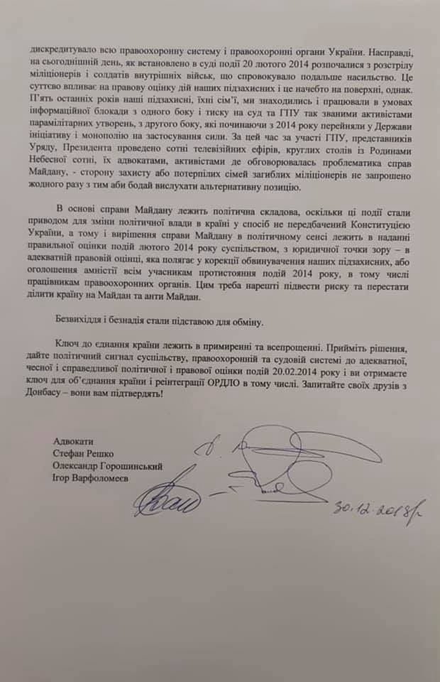 Мы уверены, что Вы, господин президент, как и мы, события расстрелов на Майдане 20 февраля 2014 наблюдали через СМИ и, очевидно, у Вас, так же как и у большинства людей, сложилось определенное предубеждение. Однако, будучи защитниками и имея возможность исследовать все обстоятельства, будучи критичными в первую очередь к себе - такое впечатление ошибочно. Политическая группировка, которая дорвалась до власти в 2014 году, использовав настроения простых людей, систематически в течение последних 5 лет героизировала Майдан и искусственно дискредитировала всю правоохранительную систему и правоохранительные органы Украины. На самом деле, на сегодняшний день, как установлено в суде, события 20 февраля 2014 г. начались с расстрела милиционеров и солдат внутренних войск, что спровоцировало дальнейшее насилие. Это существенно влияет на правовую оценку действий наших подзащитных и это вроде на поверхности. Однако пять последних лет наши подзащитные, их семьи, мы находились и работали в условиях информационной блокады с одной стороны и давления на суд и ГПУ так называемыми активистами парамилитарных образований, с другой стороны, которые, начиная с 2014 года переняли у государства инициативу и монополию на применение силы. За это время при участии ГПУ, представителей правительства, президента проведены сотни телевизионных эфиров, круглых столов с семьями Небесной сотни, их адвокатами, активистами, где обсуждалась проблематика дел Майдана. Сторону защиты или потерпевшие семьи погибших милиционеров не приглашали ни разу с тем, чтобы хотя бы выслушать альтернативную позицию.