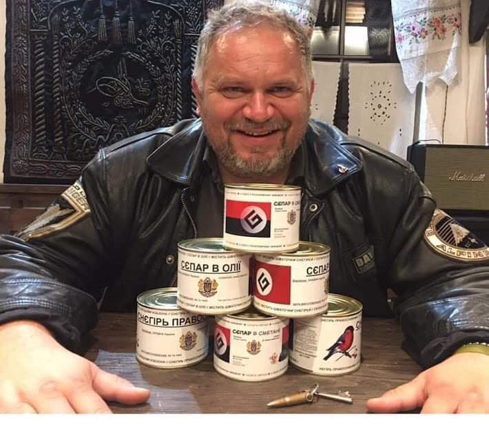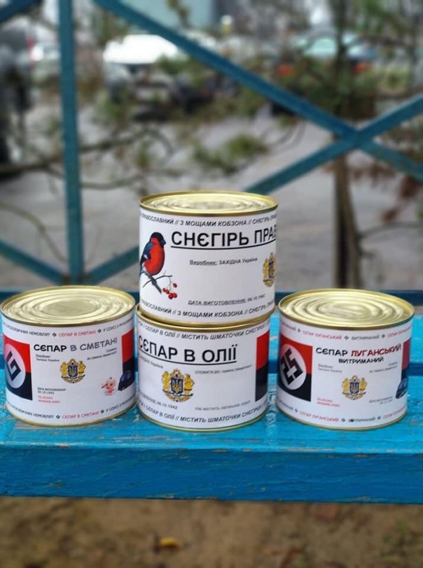 Страшно! Смотреть, как эти нелюди глумятся над усопшими. Вот только на одной из банок, по кромке этикетки, якобы тушенки консервной, написаны по-украински такие слова: «снегирь православный с мощами Кобзона». Производитель Западная Украина». На второй банке написано «Сепар в масле» Содержит кусочки луганчан». На третьей банке написано: «Содержит кусочки русскоязычных младенцев». Сверху стоят бутылки с острым соусом, напоминающим кровь. Но вдумайтесь в надпись «Палаюча дупа», «Смерть ворогам!» И все это будет мазаться на хлеб.
