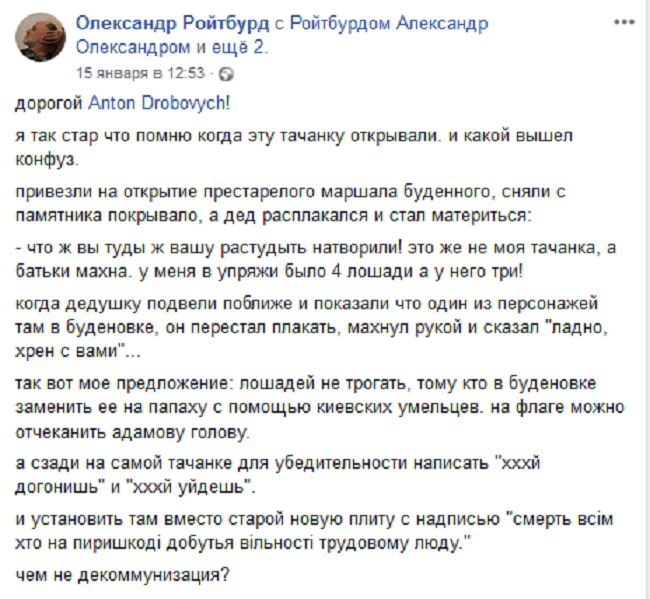 Написать «Хххй догонишь» и «Хххй уйдешь» и заменить папаху: креатив от Ройтбурда относительно «Легендарной тачанки»