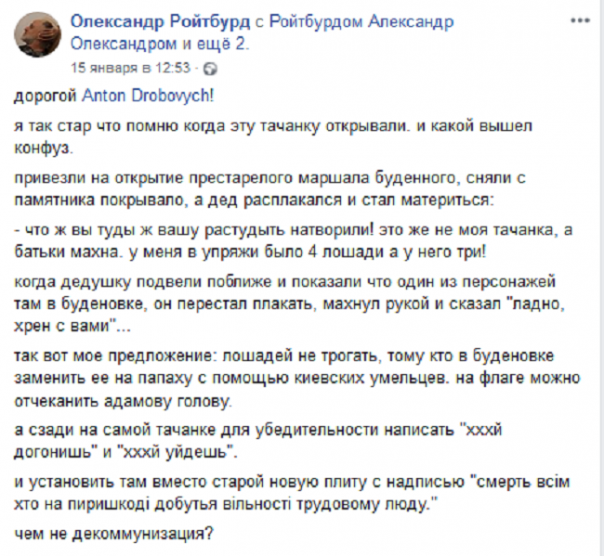 «Я так стар, что помню, когда эту тачанку открывали. И какой вышел конфуз. Привезли на открытие престарелого маршала Буденного, сняли с памятника покрывало, а дед расплакался и стал материться: "Что ж вы туды ж вашу растудыть натворили! Это же не моя тачанка, а батьки Махно. У меня в упряжи было три лошади а у него четыре!".