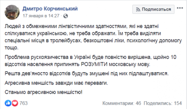Проблема русскоязычества в Украине будет полностью решена, как только 10 процентов населения прекратят ПОНИМАТЬ московский язык. Остальные девяносто процентов будут вынуждены под них подстроиться. Агрессивное меньшинство всегда имеет преимущества. Станем агрессивным меньшинством!», - отметил Корчинский.