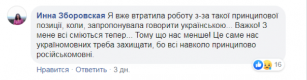 «Я уже потеряла работу из-за такой принципиальной позиции, когда предложила говорить на украинском ... Тяжело! С меня все смеются теперь ... Потому что нас меньше! Это именно нас, украиноязычных, надо защищать, потому что все вокруг принципиально русскоязычные», - посетовала в комментариях у Корчинского Инна Зборовская. Источник