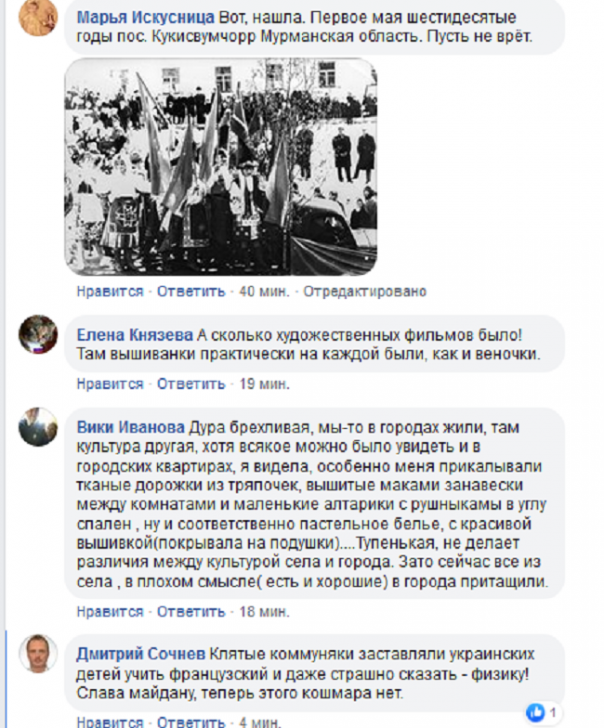 Вспомнили граждане Украины и о постоянных смотрах и конкурсах песни и танцев в украинских костюмах, и о уроках труда, на котором девочки учились вышивать крестиком украинские орнаменты и привели много фактов, отрицающих заявление Геращенко и добавили фото 70-80-х годов. Источник