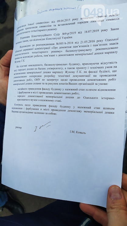 Причем в ответ на протесты возмущенных одесситов и депутата облсовета Богдана Гиганова эти бандеровские отморозки предъявили полиции не только цидулку времен экс-губернатора Саакашвили на предмет «борьбы с коммунистическими символами», но и свежую бумажку с подписью ректора нашего когда-то славного храма науки Игоря Коваля. В ней досточтимый ученый муж не возражает против снятия памятного знака, смиренно прося лишь передать его в музей.