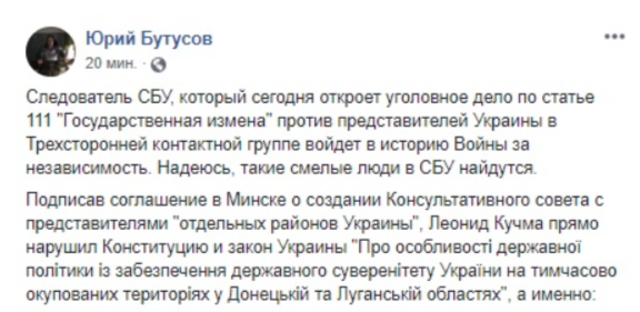 «Следователь СБУ, который сегодня откроет уголовное дело по статье 111 "Государственная измена" против представителей Украины в Трехсторонней контактной группе войдет в историю Войны за независимость. Надеюсь, такие смелые люди в СБУ найдутся. Подписав соглашение в Минске о создании Консультативного совета с представителями "отдельных районов Украины", Леонид Кучма прямо нарушил Конституцию и закон Украины "Про особливості державної політики із забезпечення державного суверенітету України на тимчасово окупованих територіях у Донецькій та Луганській областях". <...> Необходимо определить весь круг лиц, которые были причастны к этому предательскому сговору в Минске - все они должны быть привлечены к ответственности», - негодует журналист, главред Цензор.НЕТ Юрий Бутусов.