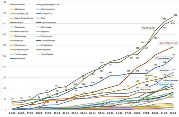 По данным МИД Украины, в настоящее время за границей от коронавируса лечатся 175 граждан страны. Больше всего их в Италии — 121, Греции — 22 и Чехии — 6. Министерство здравоохранения Украины опубликовало динамику распространения коронавируса по областям.
