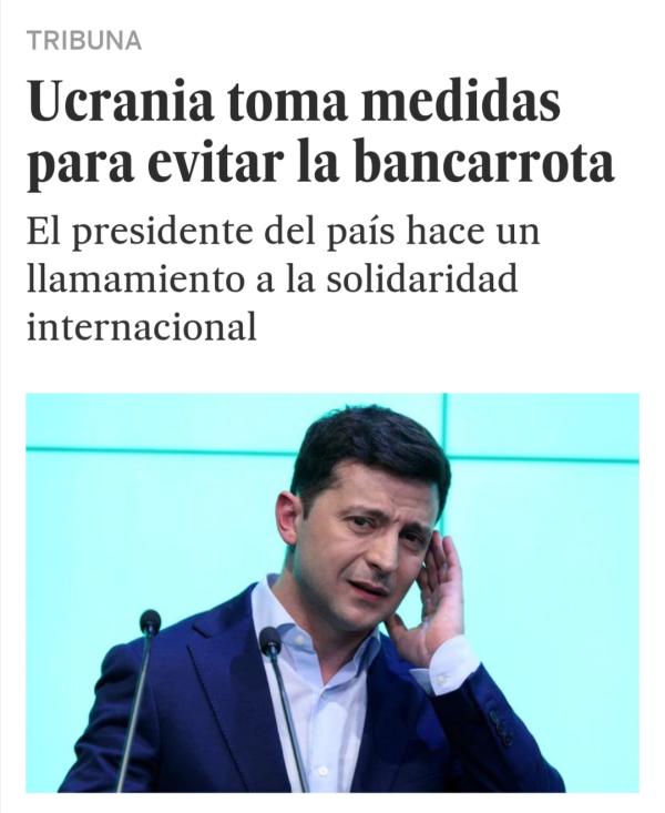 Именно так называется статья Зеленского. Вернее, называлась. Заголовок, согласитесь, саморазоблачительный: Зеленский год у власти, а над страной уже вовсю носится призрак банкротства. Дальше можно не читать. Непонятно, где спохватились — то ли в Офисе президента, где уже с утра статью распечатали и положили в красной папочке для хозяина Банковой, то ли в посольстве Украны в Испании поняли, что дали маху. Но дело не в этих деталях: стреляющий в ногу новой власти заголовок провисел полдня, пока его не сменили по требованию Украины на другой — скучный и канцелярский — «Украина принимает меры, чтобы избежать банкротства».