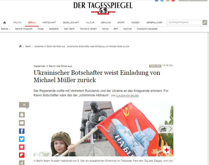 «Украинский дипломат отказался от участия в совместных мероприятиях, сообщив в комментарии СМИ, что «ценит приглашение со стороны берлинского мэра, ибо оно признаёт вклад украинского народа в освобождение Европы от нацистской деспотии».