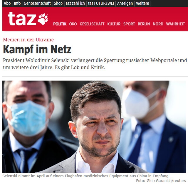 Тема «Миротворца» снова всплыла в германских СМИ в контексте решения украинских властей о продлении запрета российских интернет порталов. «Борьба в сети. Президент Владимир Зеленский продлил запрет российских интернет порталов и почтовых программ ещё на три года – за это его как хвалят, так и критикуют», - пишет издание Tageszeitung.