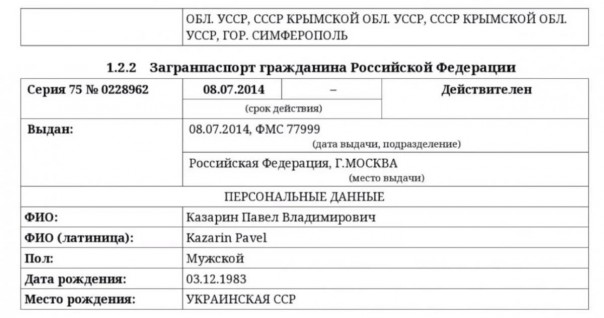 Но я не об этом. И даже не о том, что Казарин пользовался своими двумя российскими паспортами (общегражданским и заграничным), полученным еще в марте и летом 2014 года. Казарин, повторяю, не только косил под умного, но и подстилал соломку. Но все равно он тупой – мог бы понять, что тайное всегда становится явным. Особенно если задаться целью вывести фигуранта на чистую воду. Шарий это и сделал. Молодец!
