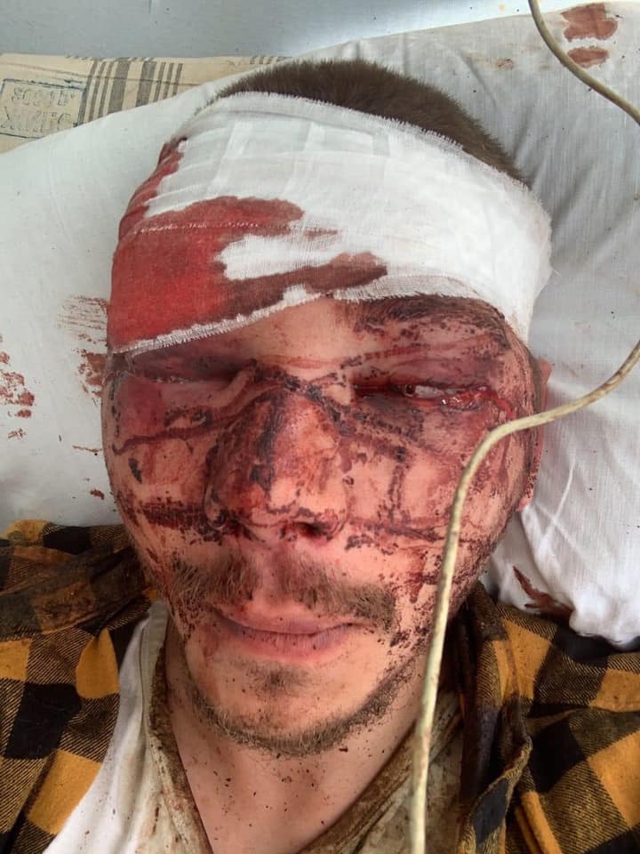 Его имя — Никита. Он в реанимации. 17 июня он участвовал в мирной демонстрации напротив офиса президента Украины. За 2 часа перед нападением на него, он писал заявление в полицию об угрозах со стороны «начштаба» харьковского Нацкорпуса Жорина.
