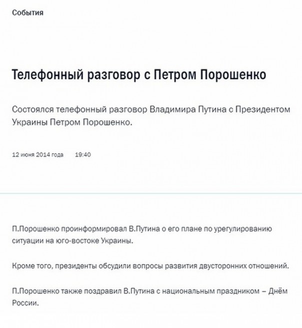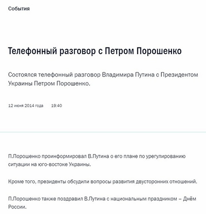 Отметим, 12 июня 2014 года на сайте Кремля сообщалось: