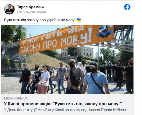 «Руки прочь от закона об украинском языке!» — написал он, поддержав активистов сообщества «Язык объединяет», которые в Киеве на День Конституции провели акцию в защиту украинского языка.