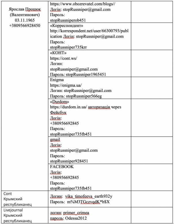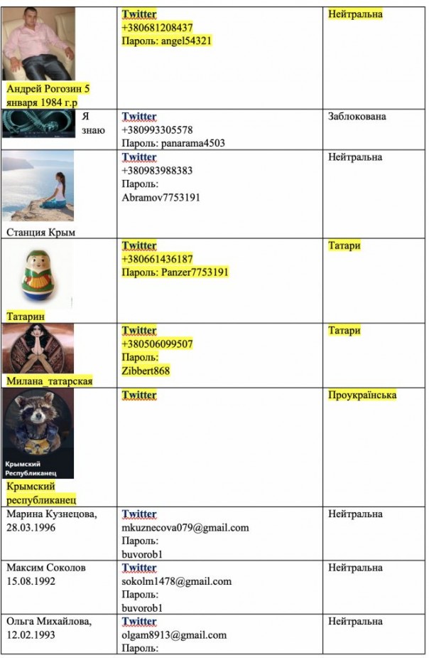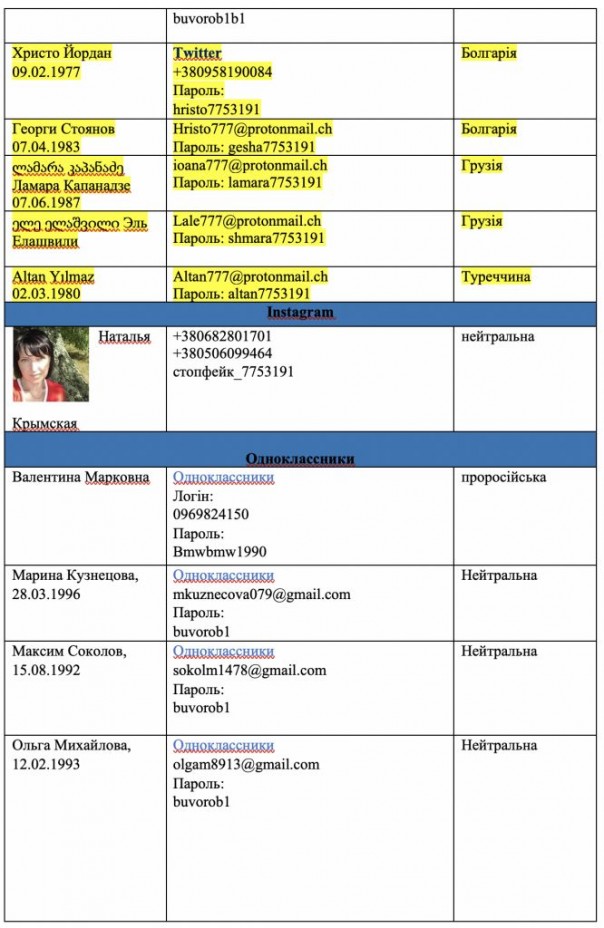 Но это что касается псевдо-личностей, персонажей вымышленных для красоты, картинки и прочих функции. Но в этом многочисленном войске украинских бесов есть целые отряды банальных троллей. Их задача — спамить комментами, лайкать и дизлайкать, «бить в набат», в общем наводить информационный шорох по приказу кураторов 83-го центра ИПсО ССО ВСУ. Эта полурота троллей рвется в бой, готовясь информационно воевать с Россией от имени «униженных и оскорбленных крымчан», болгар, грузин и прочей публики. В таблице указаны и пароли аккаунтов в соцсетях. Что характерно, в таблице троллей крайняя правая графа обозначена как «Позиция». У некоторых (единицы) она обозначена, как «пророссийская». Это наводит на мысль о том что аккаунты взломаны, и от имени обывателя мир информации засоряют все те же старлеи и «пидпилкывныки 83-го Центра ИПсО ССО ВСУ и провокаторы на аутсорсинге.