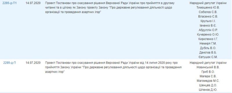 Как сообщается на сайте Верховной Рады Украины, 14 июля были зарегистрированы проект постановления №2286-д-П, инициированный группой нардепов во главе с Вадимом Новинским, и проект постановления №2286-д-П1 - группа депутатов фракции «Батькивщина» и внефракционных во главе с Юлией Тимошенко.