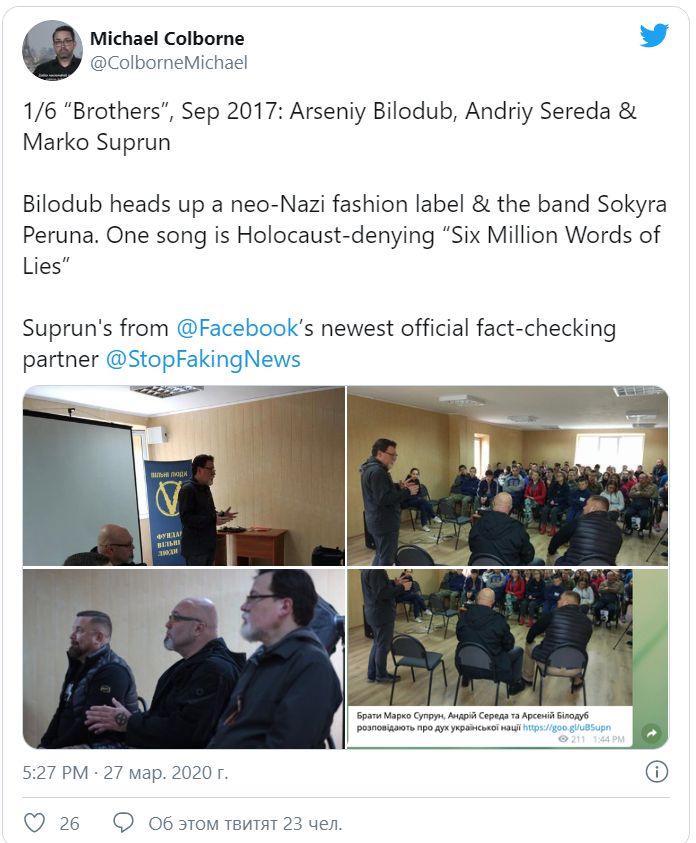 27 марта 2020 года, когда StopFake торжественно сообщил на своем сайте о том, что «стал партнером Facebook по борьбе с фейками на Украине», работающий в Киеве канадский журналист Майкл Колборн написал в Twitter небольшой тред о связях между StopFake и украинскими ультраправыми. Соединяющая их фигура — Марко Супрун, муж бывшего министра здравоохранения Ульяны Супрун.