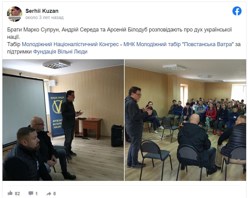 Действительно, если поискать в соцсетях, можно узнать, что фотографии выступающих перед молодежью Супрун, Климачева и Середы датированы 30 сентября 2017 года и сделаны в лагере «Повстанческая Ватра», проведенном в Киевской области МНК при поддержке «Вольных людей» и Министерства молодежи и спорта Украины.