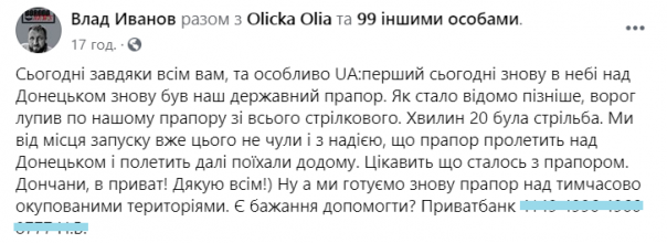 «Сегодня снова в небе над Донецком снова был наш государственный флаг. Как стало известно позже, враг бил по нашему флагу со всего стрелкового. Минут 20 была стрельба», – написал он.