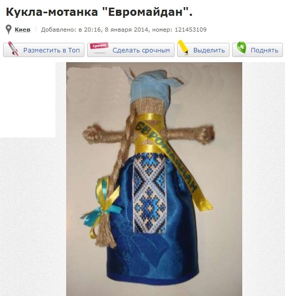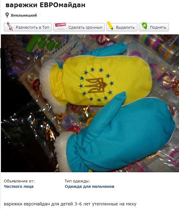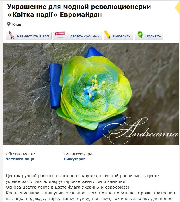 Среди объявлений больше всего атрибутики и одежды с евросимволикой. Например, шапки и перчатки можно приобрести за 65 гривен. Есть и предложения для модниц-революционерок. Им предлагают украшение «Квітка надії» за 50 гривен.