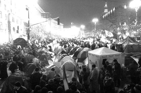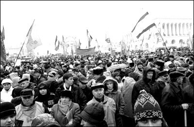 Позади них 50 палаток увешанных флагами и плакатами были растянуты на колышках, вбитых в щели между гранитными плитами. На большом оранжевом (!!!) плакате перечислены требования студентов: отставка премьера Виталия Масола, новые многопартийные выборы весной, национализация собственности компартии, отказ от союзного договора, возвращение на Украину всех военнослужащих, которые служат за её пределами. Число голодающих изменяется ежедневно – некоторые слабеют и новые занимают их место. В пятницу их было 154 и столько же в группах поддержки и секьюрити. Половина студентов – со Львова. Большинство среди оставшейся половины - киевляне. Есть небольшие группы с Винницы, Ивано-Франковска и Дрогобыча, а также отдельные люди с Восточной Украины. Все гордо показывают на Нилу Крюкову, которая голодает с ними с первого дня. Для большинства студентов голодовка – меньшая проблема, нежели холодная не по сезону погода. Лишь немногие приехали с соответствующей одеждой. Однако киевляне несут им деньги, раскладушки, одеяла, свитера, носки куртки, термосы с чаем и цветы».