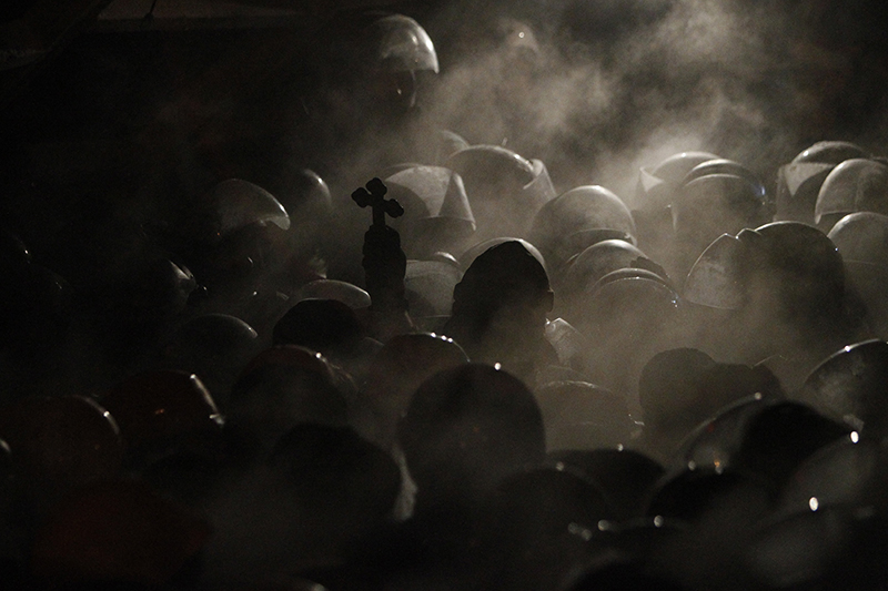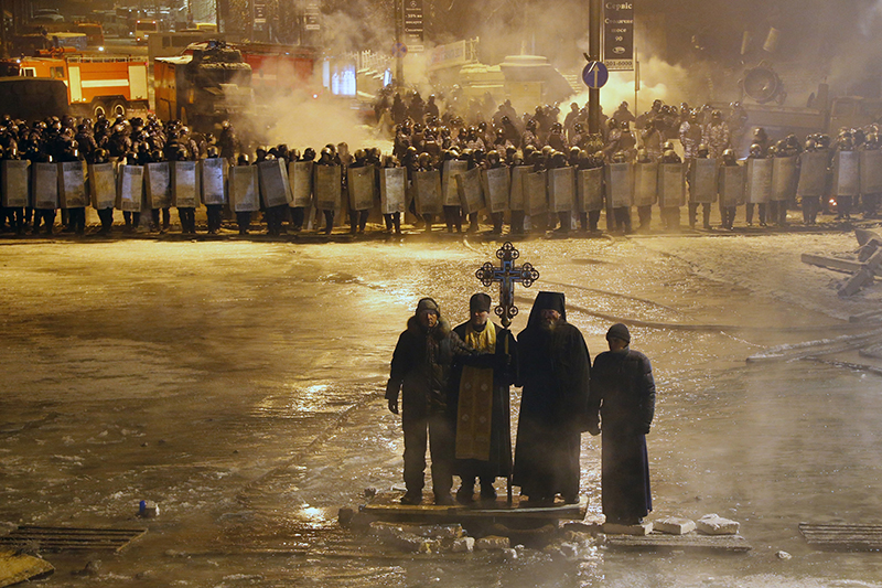 На фото: православные священники между колонной милиции и толпой протестующих.16-17 января власти Украины принимаю законы о введении частичной цензуры в СМИ и интернете, ужесточении наказания за участие в массовых беспорядках и усилении контроля при покупке SIM-карт. Это еще больше обострило ситуацию. С середины января почти каждый день происходят столкновения между милицией и протестующими, которые постоянно жгут покрышки.