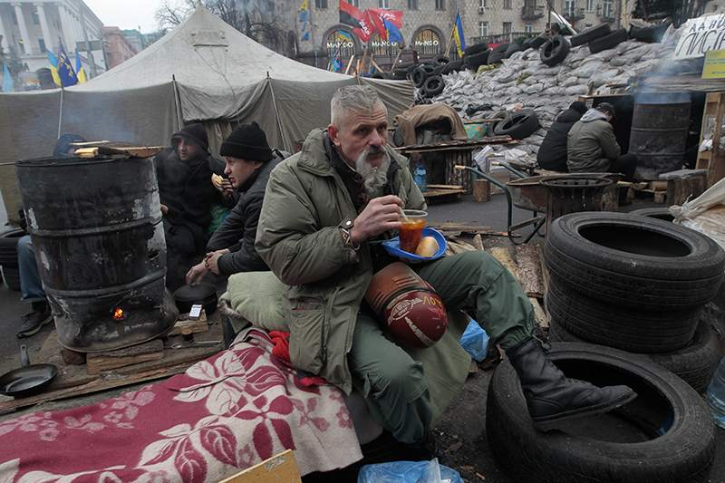 На фото: столкновения в центре украинской столицы, 25 января. Сторонники оппозиции пьют чай на расположенной рядом с Майданом улице Грушевского.
