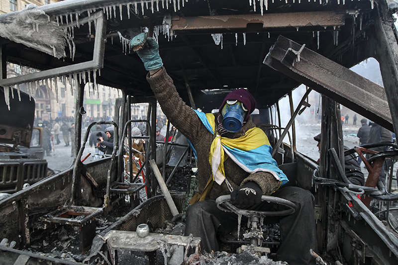 На фото: сторонник Евромайдана в сгоревшем милицейском автобусе, 20 января.Столкновения между милицией и протестующими на улице Грушевского, на которой находятся здания украинского кабинета министров, Верховной рады и ряда ключевых министерств.